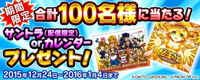 「パチスロ 秘宝伝 ~伝説への道~」の配信を記念して、 抽選で計100名様に、 「秘宝伝 ~伝説への道~」サウンドトラック(配信限定)または「大都技研 2016年卓上カレンダー」が当たるキャンペーンを開催致します。 キャンペーンページ( http://sp-simulator.com/slot/densetsu-hihouden/campaign/ )から欲しい賞品をツイートするだけで簡単にご応募頂けます。 是非ご参加ください!