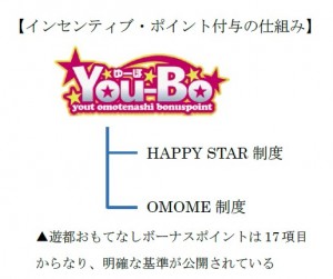 ・インセンティブ・ポイント付与「遊都おもてなしボーナスポイント」…ベネフィット・ワン社のポイントシステムを2014年10月に採用し、OMOME制度、ハッピースター制度と連動した「遊都おもてなしボーナスポイント(略称:ゆーぼ)」の付与基準を設けました。おもてなしに特化したこのポイントは、理念を実践しているスタッフに対して、スタッフ同士の褒め合いによって発生します。