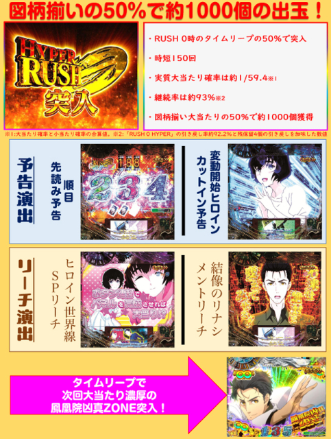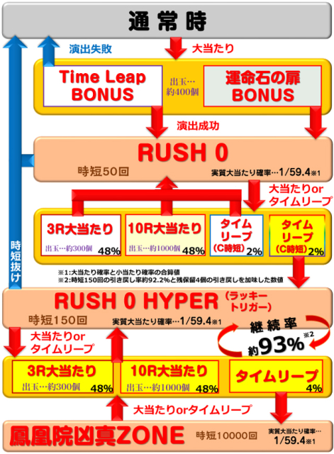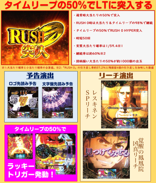 ※RUSH 0(時短50回)時 3R(実質3R)通常(時短50回)…48% 10R(実質10R)通常(時短50回)…48% 出玉なし(時短50回)…2% 出玉なし(時短150回)…2% ※RUSH 0 HYPER(時短150回)時 3R(実質3R)通常(時短150回)…48% 10R(実質10R)通常(時短150回)…48% 出玉なし(時短10000回)…4% |
