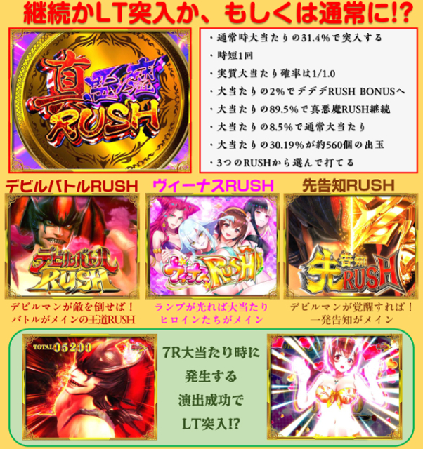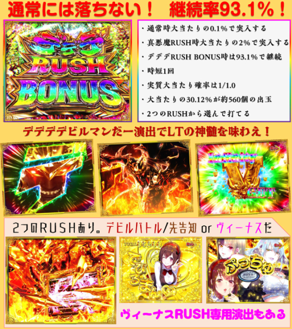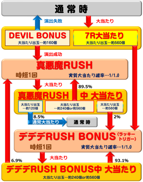 2R(実質2R)通常(時短なし)…68.5% 2R(実質2R)通常(真悪魔RUSH突入)…31.4% 7R(実質7R)通常(デデデRUSH BONUS突入)…0.1% |