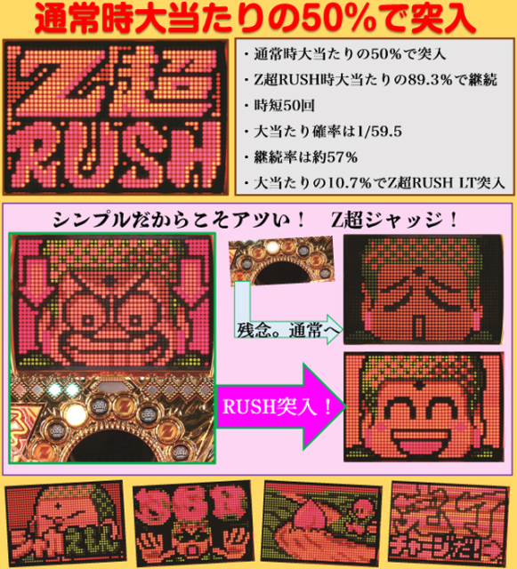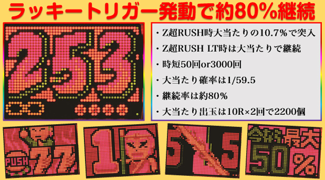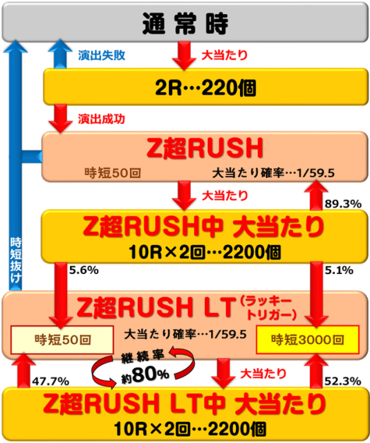 Z超RUSH時 10R(実質10R)通常(実質2200個獲得後、時短50回)…89.3% 10R(実質10R)通常(実質2200個獲得後、時短50回(Z超RUSH LT突入))…5.6% 10R(実質10R)通常(実質2200個獲得後、時短3000回(Z超RUSH LT突入))…5.1% Z超RUSH LT時 10R(実質10R)通常(実質2200個獲得後、時短50回)…47.7% 10R(実質10R)通常(実質2200個獲得後、時短3000回)…52.3% |