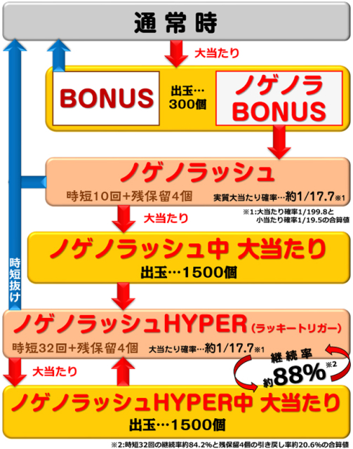 RUSH中実質大当たり確率(大当たり確率1/199.8と小当たり確率1/19.5の合算値) | 約1/17.7 |