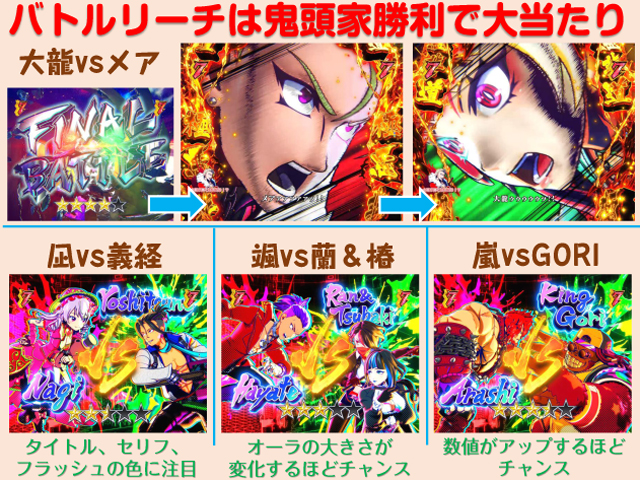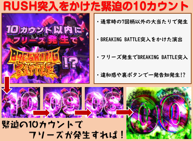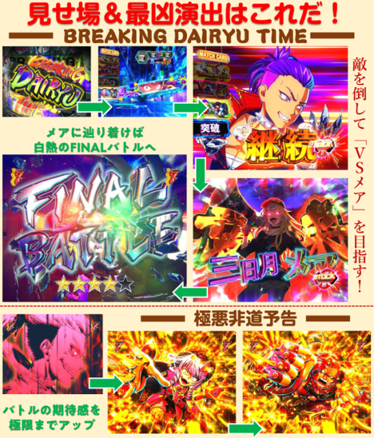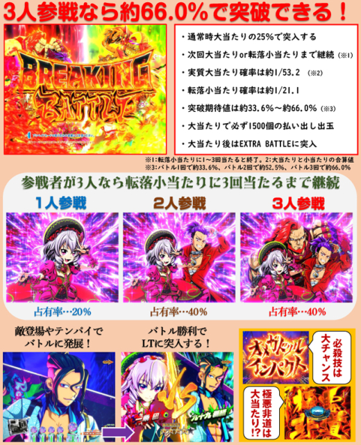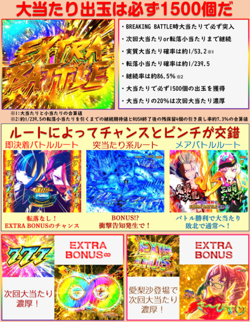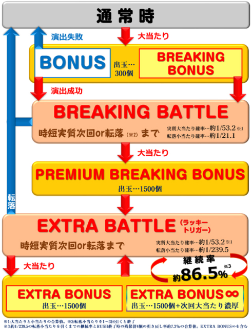 BREAKING BATTLE時 10R(実質10R)通常(EXTRA BATTLE突入)…100% EXTRA BATTLE時 10R(実質10R)通常(EXTRA BATTLE継続)…80% 10R(実質10R)通常(次回大当たり濃厚+EXTRA BATTLE継続)…20% |