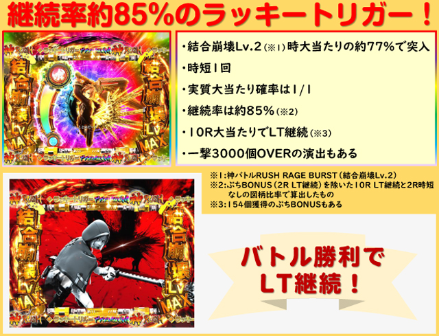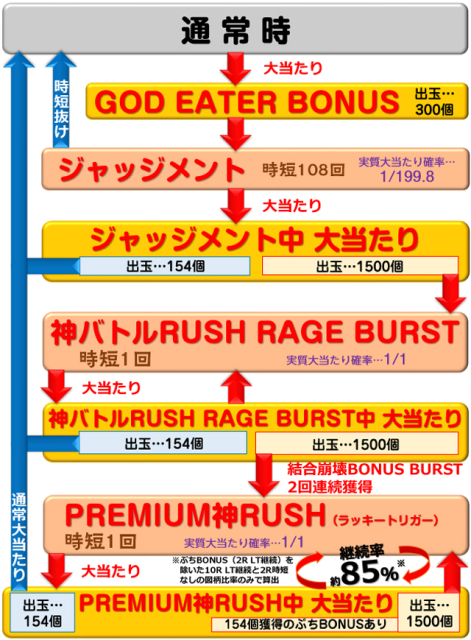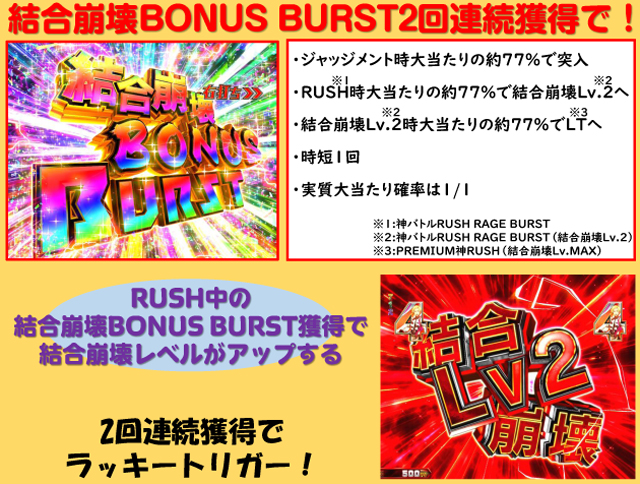 2R(実質2R)通常(時短108回)…100% | ジャッジメント時 2R(実質2R)通常(時短なし)…約23% 10R(実質10R)通常(神バトルRUSH RAGE BURST突入)…約77% 神バトルRUSH RAGE BURST時 2R(実質2R)通常(時短なし)…約23% 10R(実質10R)通常(PREMIUM神RUSH突入※)…約77% ※結合崩壊BONUS BURST2回連続獲得時 PREMIUM神RUSH時 2R(実質2R)通常(時短なし)…約15% 10R(実質10R)通常(PREMIUM神RUSH継続)…約85% ※2R(LT継続)のぷちBONUS(154個獲得)もある |