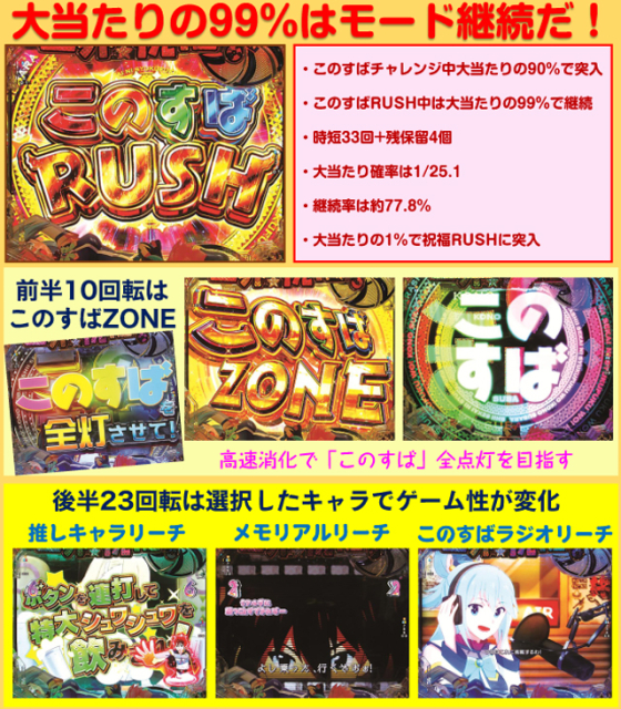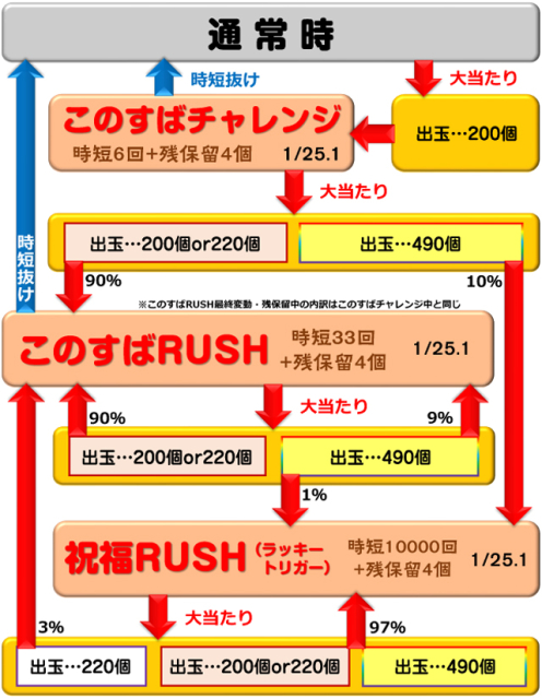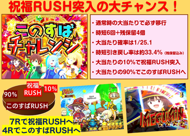 | 4R(実質4R)通常(時短6回)…100% | ※このすばチャレンジ中/このすばRUSH最終変動/残保留 4R(実質4R)通常(時短33回)…90% 7R(実質7R)通常(時短10000回)…10% ※このすばRUSH中 4R(実質4R)通常(時短33回)…90% 7R(実質7R)通常(時短33回)…9% 7R(実質7R)通常(時短10000回)…1% ※祝福RUSH中 4R(実質4R)通常(時短33回)…3% 4R(実質4R)通常(時短10000回)…87% 7R(実質7R)通常(時短10000回)…10% |