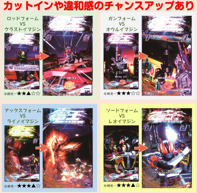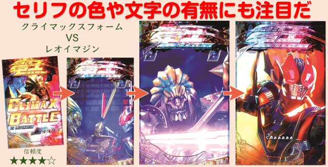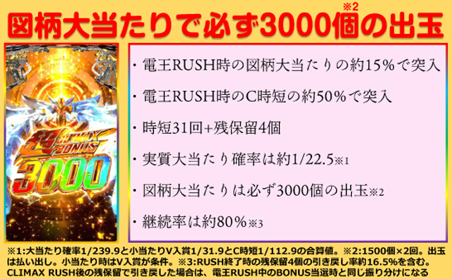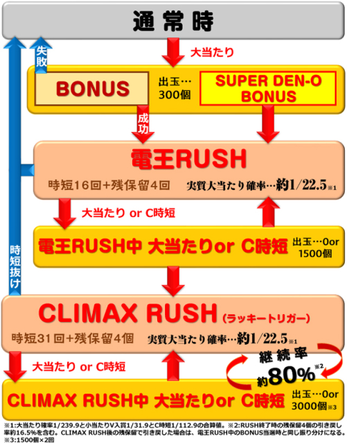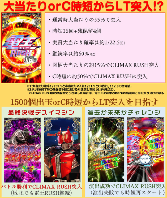 電王RUSH時 C時短(時短16回)…約10% C時短(時短31回)…約10% 10R(実質10R)通常(時短16回)…約68% 10R(実質10R)通常(時短31回)…約12% CLIMAX RUSH時 C時短(時短31回)…約20% 10R(実質10R)通常(実質3000個獲得後、時短31回)…約80% |