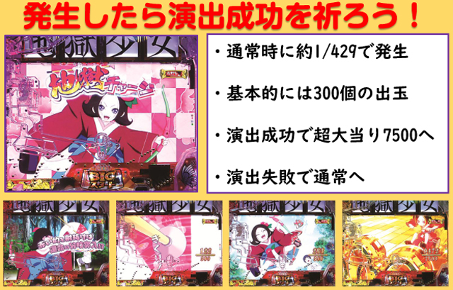 | 地獄ジャッジ成功率(各演出の発生・成功確率。条件装置作動確率とは異なる) | 約1/18 |