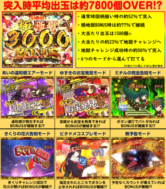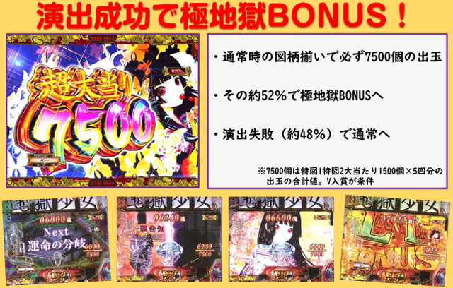 極地獄BONUS時 1500個出玉(地獄チャレンジ)…約23% 1500個出玉(極地獄BONUS継続)…約77% ※V当たりに関してはV入賞が条件 地獄チャレンジ時 1500個出玉(地獄チャレンジ継続)…約50% 実質3000個(特図2大当たり2回分の出玉の合計値。V入賞が条件)獲得後、極地獄BONUS…約50% ※V当たりに関してはV入賞が条件 |