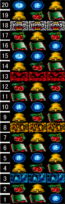 液晶リールに出現の紋章図柄で周期到達までの残りゲーム数を示唆し、白紋章より黒紋章、1個より2個のほうが期待できる(黒紋章3個は周期到達確定)。