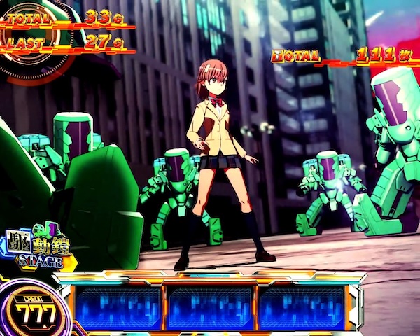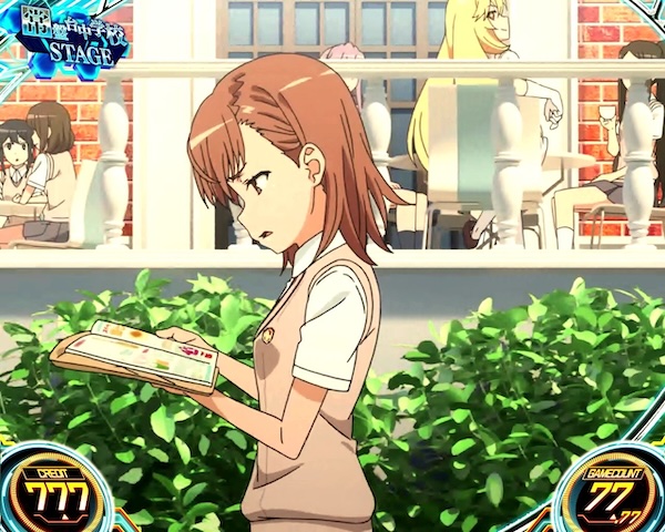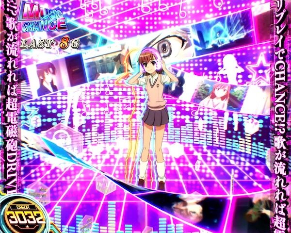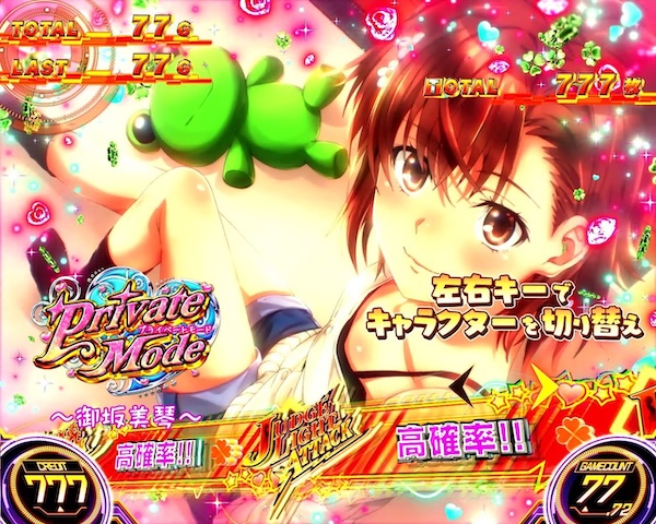超電磁砲コインはゲーム数上乗せ濃厚(さらに約3分の1で特化ゾーン「JUDGE LIGHT ATTACK」へ)、スイカやチェリーはゲーム数の上乗せや超電磁砲コインの出現など抽選、スイカの一部で「おねだりミッション」へ、ゲーム数消化からのBONUSもあり、BONUS当選時の一部で上位ATへ(BONUS3回目以降はチャンス)