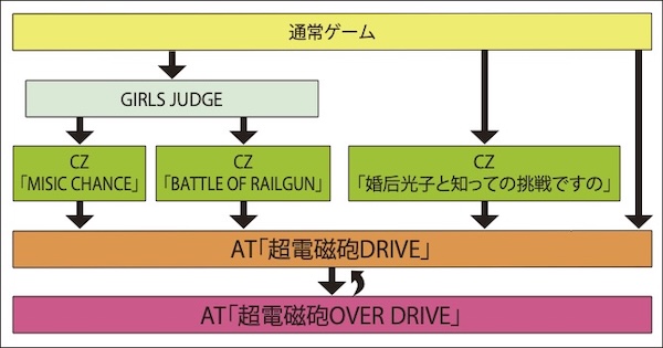 通常ゲーム中は超電磁砲コインでCZを抽選し、CZ成功などでATへ。
