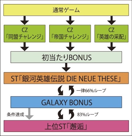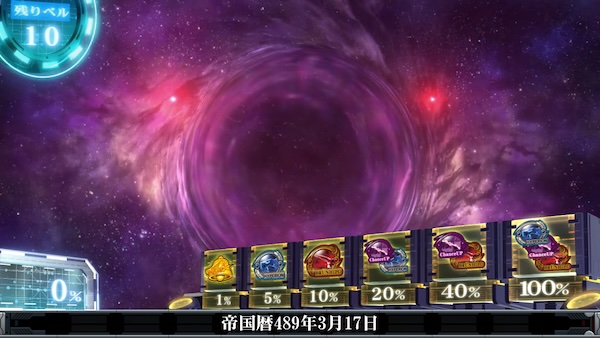 突入経路に応じた陣営(自由惑星同盟ルートor銀河帝国ルート)によってゲーム性が変化、7チャレンジ発生時は押し順正解で7が揃いギャラクシーセブンクラッシュへ、STループ率は一律66%